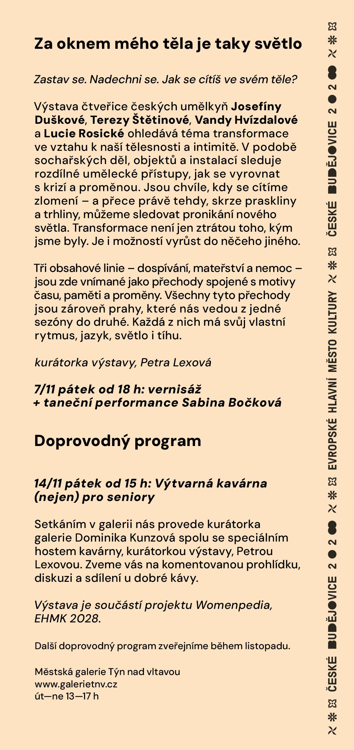 srdečně zvu na výstavu Za oknem mého těla je taky světlo do Týna nad Vltavou, které se účastním.