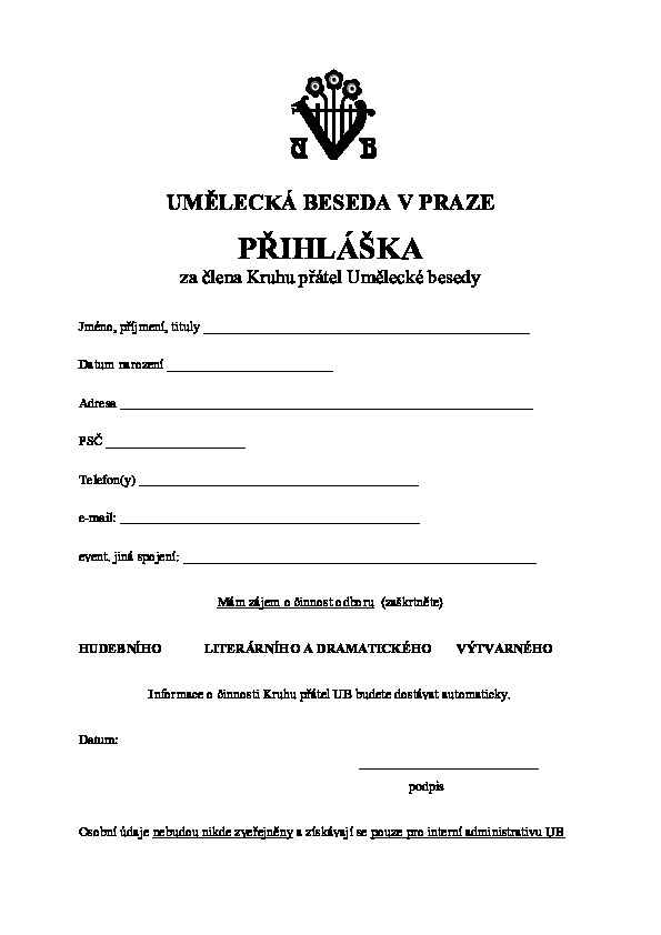 Pozn.: Při vyplňování přihlášky do Kluhu přátel Umělecké besedy poskytujete své osobní údaje dle zákona o zpracování osobních údajů č. 110/2019 Sb. Umělecká beseda si uvědomuje důvěrnost Vašich osobních údajů a řídí se tímto zákonem.
